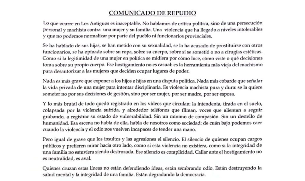 El comunicado de repudio de la concejal Fany Aguirre y de los funcionarios de Los Antiguos lo dice claro: esto no es crítica política, es hostigamiento personal y machista. Y lo que quedó registrado en los videos es brutal: Zulma Neira, tirada en el suelo, colapsada, mientras alrededor había gente filmando y alentando en vez de tenderle una mano.