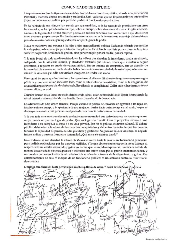 Hasta el momento, no hubo declaraciones oficiales de los concejales ni de funcionarios provinciales sobre el caso, aunque un sector del arco político de Los Antiguos difundió un comunicado de apoyo a la intendenta, repudiando el hostigamiento que —según señalaron— sufre desde hace tiempo.